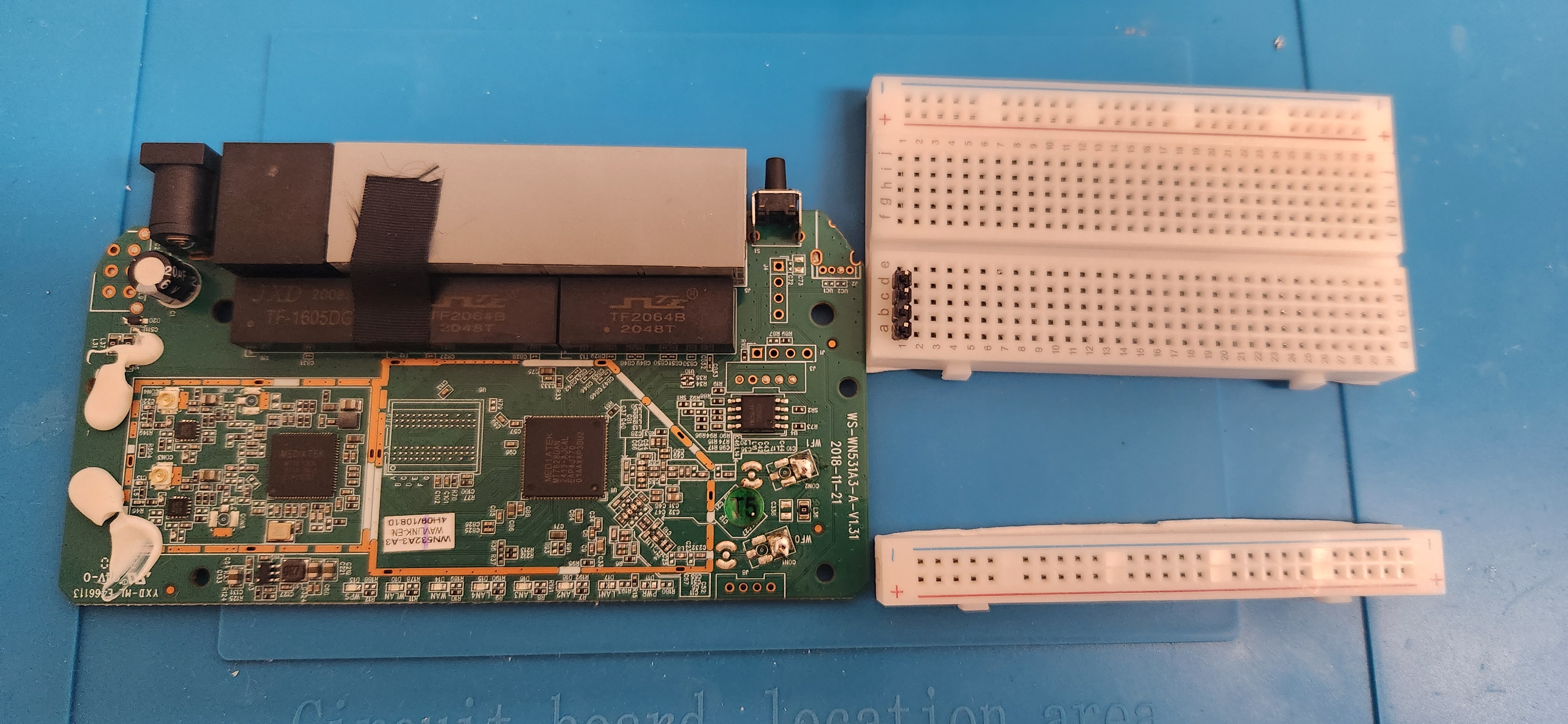 With my increased physical access, I got a strip of male pin headers, cracked off four of them, took the PCB out of the Wavlink router, and soldered them with a dev breadboard beneath as a jig to ensure stability and a straight connection. I had to break off the power strip of the breadboard I had laying around so that I could line it up with the board without hitting other components.