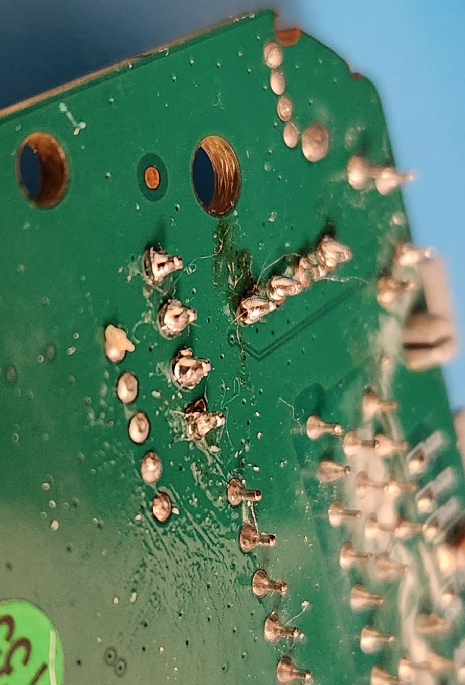 I started poking around the pin headers and found that I was able to wiggle them from left to right with very little resistance. The solder didn’t seem to properly bind between the copper lining the through-holes on the board and the pin. While soldering, the solder seemed to stick to the iron rather than the copper.